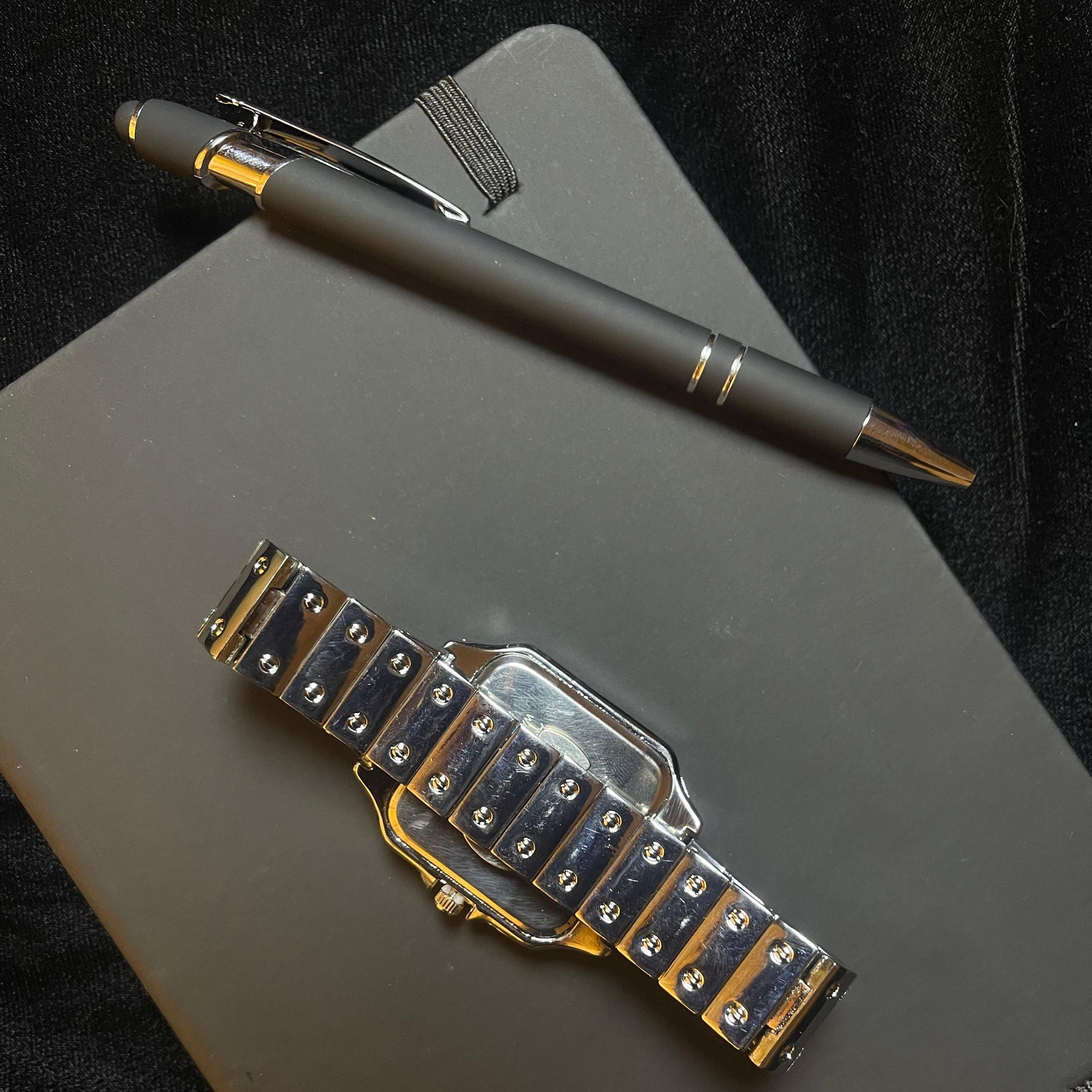 Cartier Santos blends precision engineering with enduring elegance. Crafted from polished stainless steel, this iconic square-case design embodies Cartier’s signature luxury and craftsmanship. The Roman numeral dial, blue sword-shaped hands, and exposed screws on the bracelet reflect the watch’s distinctive character.